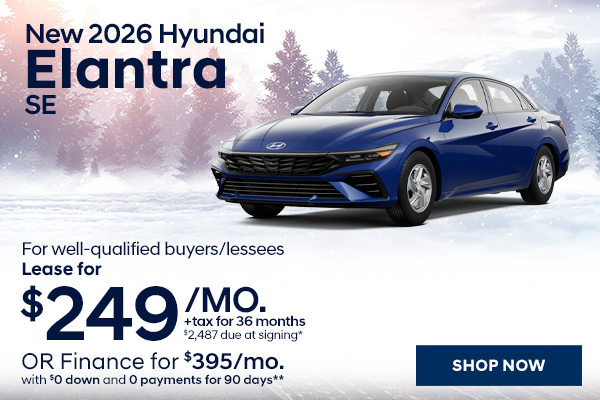 Lease a New 2026 Hyundai Elantra SE for $249/mo OR Finance for $395/mo (STOCK# Y54646, MSRP $24,480) *Well-qualified lessees may lease for $249/mo for 36 months with $2,487 total due at signing (includes down payment, first monthly payment, bank acquisition fee, $784 doc & title prep fees, $0 security deposit). Sales tax, title, reg/license fees additional. Closed end lease. 7,500 miles/year. **Well-qualified buyers may finance through HMF for $395/mo. Finance amount (Selling Price) $24,905 (MSRP $24,480 minus $359 dealer discount plus $784 doc & title prep fees) for 72 months at 4.49% annual percentage rate financing. Sales tax, title, reg/license fees additional. ALL OFFERS: Not all will qualify. All incentives to dealer, cannot be combined with other offers. Take delivery by 3/2/2026.