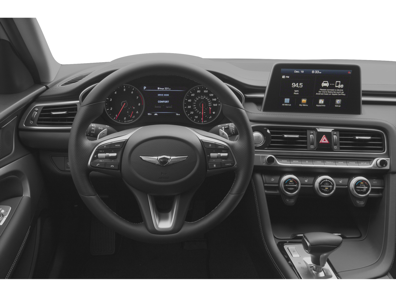 - Radio: AM/FM/HD Radio/SiriusXM Audio System -inc: 8-inch touchscreen display, 6-speakers including subwoofer, 6-channel internal amplifier, auto volume control, Bluetooth® hands-free phone system, Android Auto, Apple CarPlay, 2 front USB ports, auxiliary input jack and Genesis Connected Services telematics