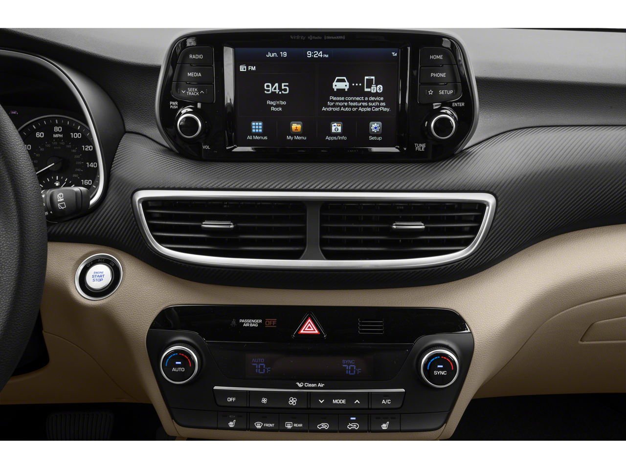 - Radio: Infinity Audio System -inc: 315-Watt, 7" color touchscreen, Apple CarPlay, Android Auto, 8 speakers, USB/AUX input jack, Bluetooth® hands-free phone system, SiriusXM satellite radio, HD Radio, VR, Blue Link connected car system, Clari-Fi music restoration technology, external amplifier and wireless device charging
